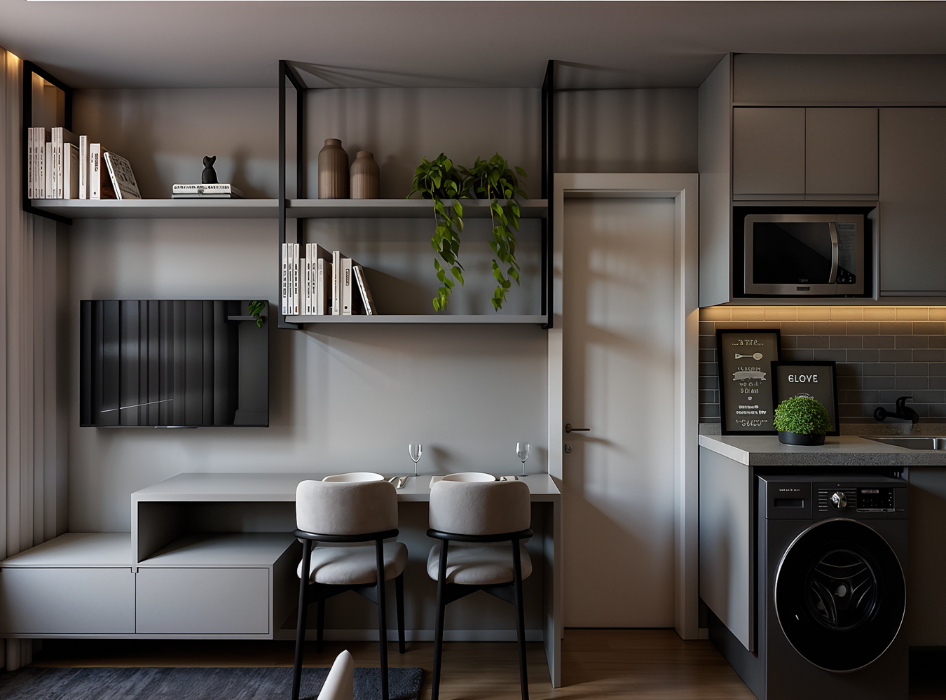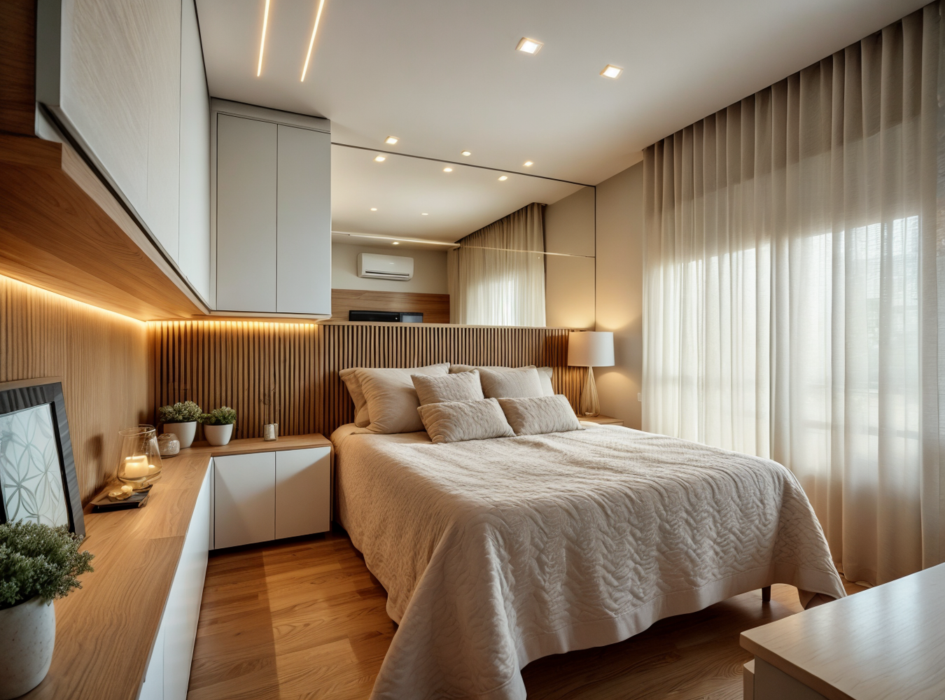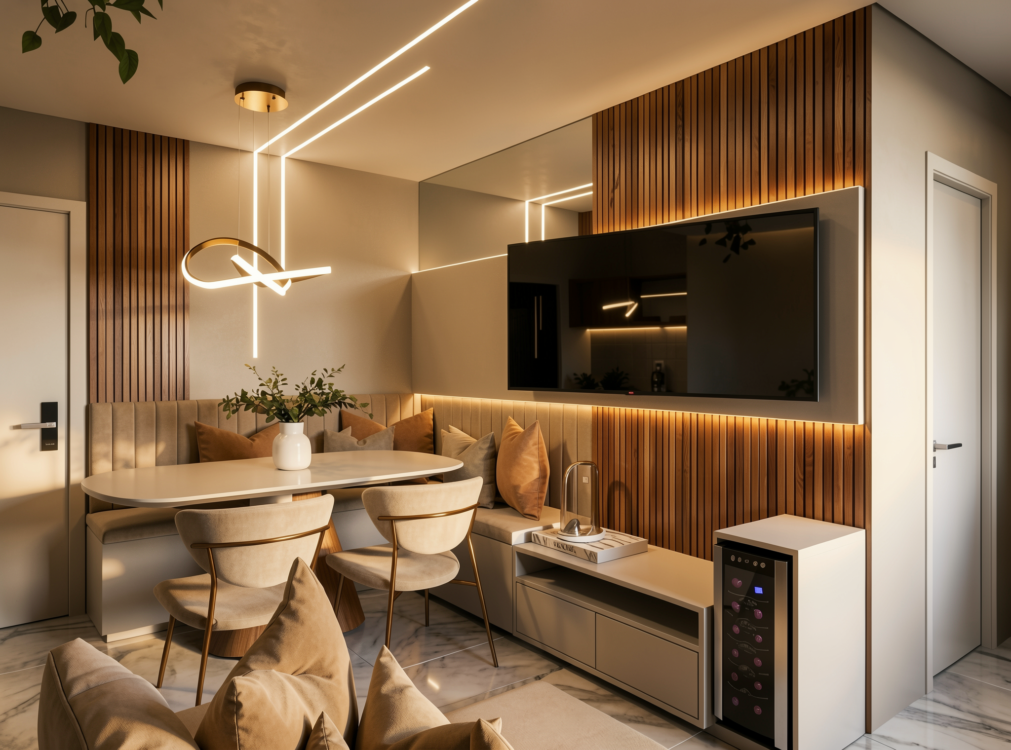 Desenvolvimento completo para pequenos ambientes, com soluções inteligentes de layout, mobiliário, iluminação e materiais duráveis, criando espaços funcionais, organizados e esteticamente coerentes.
